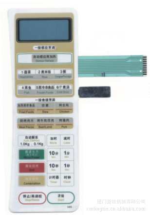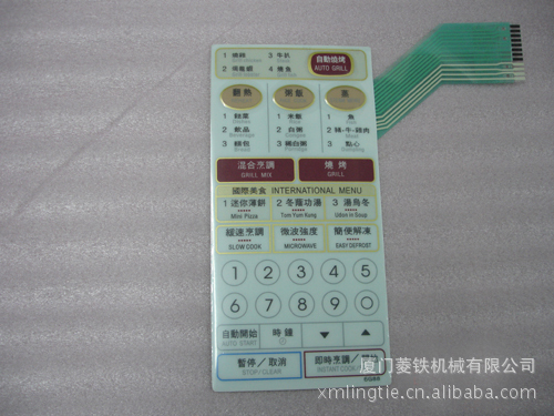 上图为微波炉面板,按键样品,图片仅供参考,菱铁丝印机专业印刷微波炉面板,按键。