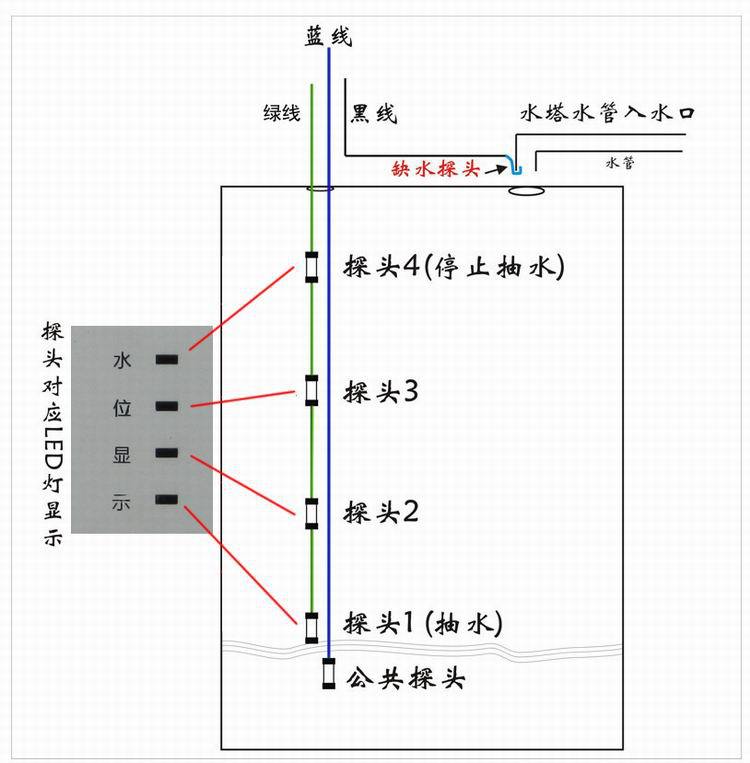 →安装简单,将电晟全自动水位控制器插入电源插座,水泵插在控制器上的插孔,水位设定,将高低水位探头放入水塔合适的高低水位位置,共用探头放入水塔水底,即可使用。