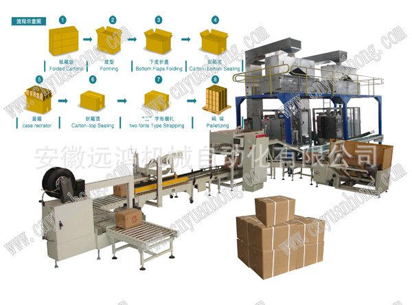 产品优点: 该装箱线由全自动包装机、开箱机、自动装箱机、自动封箱机、自动捆扎机等组成。散状物料经过全自动包装机进行包装,包好的袋装成品通过输送生产线进行理包整理,转向排序,加速缓冲,再以一定的数量自动有序的装入纸箱,通过压平机进行整理,全自动封箱机构按要求封好纸箱,自动捆扎机进行捆扎带,最后由物流线输出。