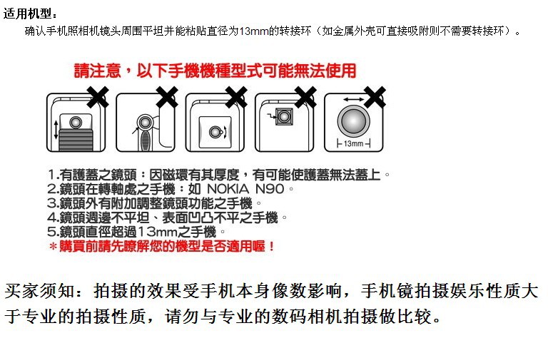 确认手机照相机镜头周围平坦并能粘贴直径为13mm的转接环(如金属外壳可直接吸附则不需要转接环)。本品附赠有IPHONE4手机专用的转接环。