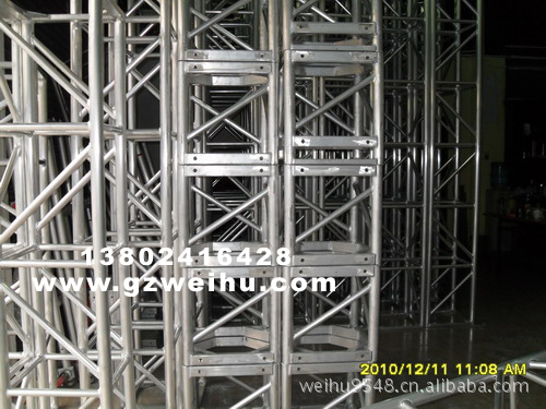 一、铝合金舞台灯架 桁架: 铝合金灯架材料均选用国际优质铝材6061-T6/6082-T6, 主管50mm ,壁厚3mm ,单排架,三角架,四方架,长度0.5m / 1m / 1.5m / 2m / 2.5m / 3m / 3.5m / 4m