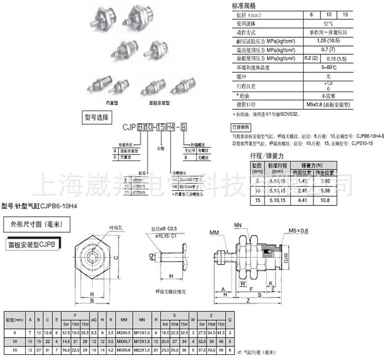 CJPB针型气缸 SMC针型缸 单作用气缸 面板安装气缸 埋入型安装