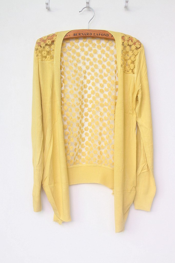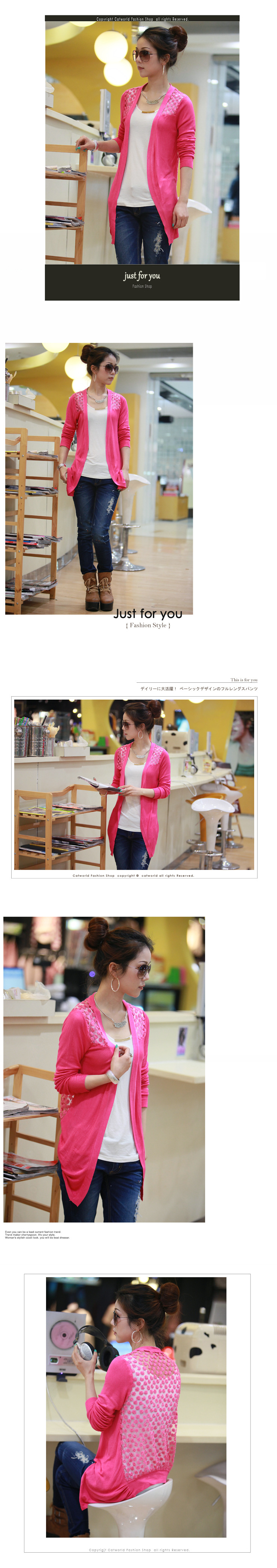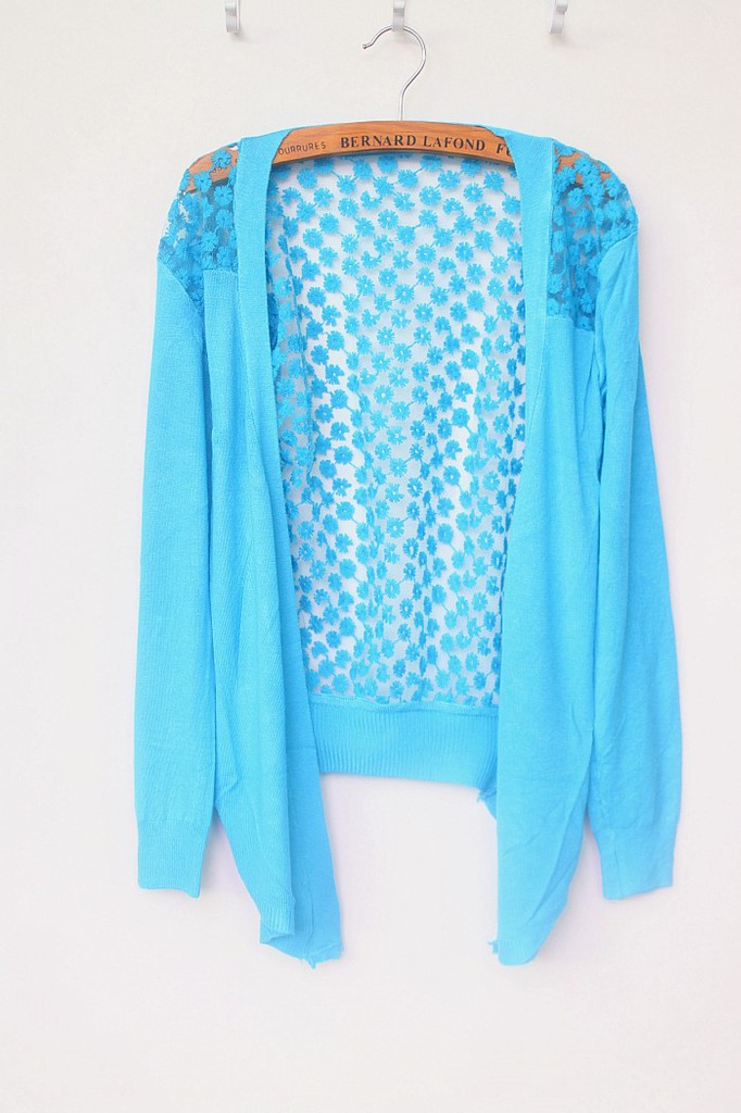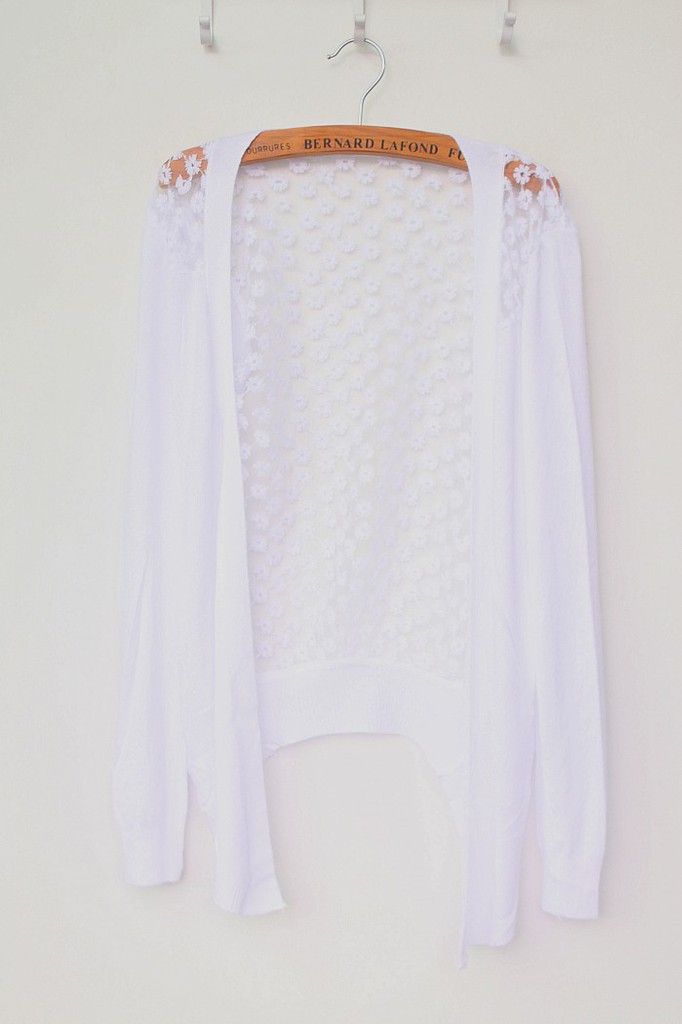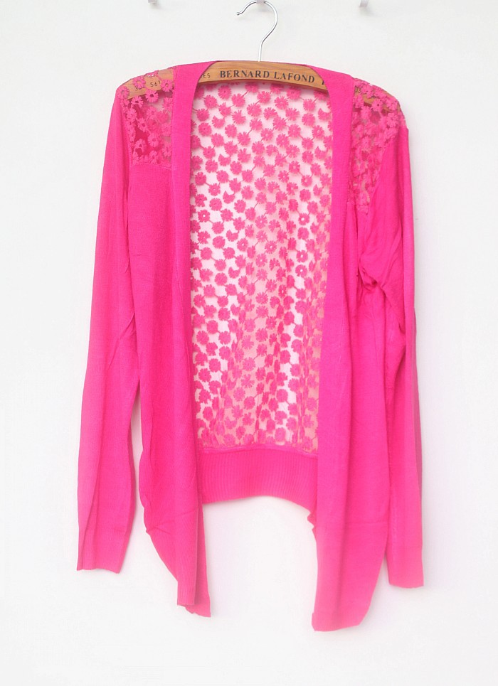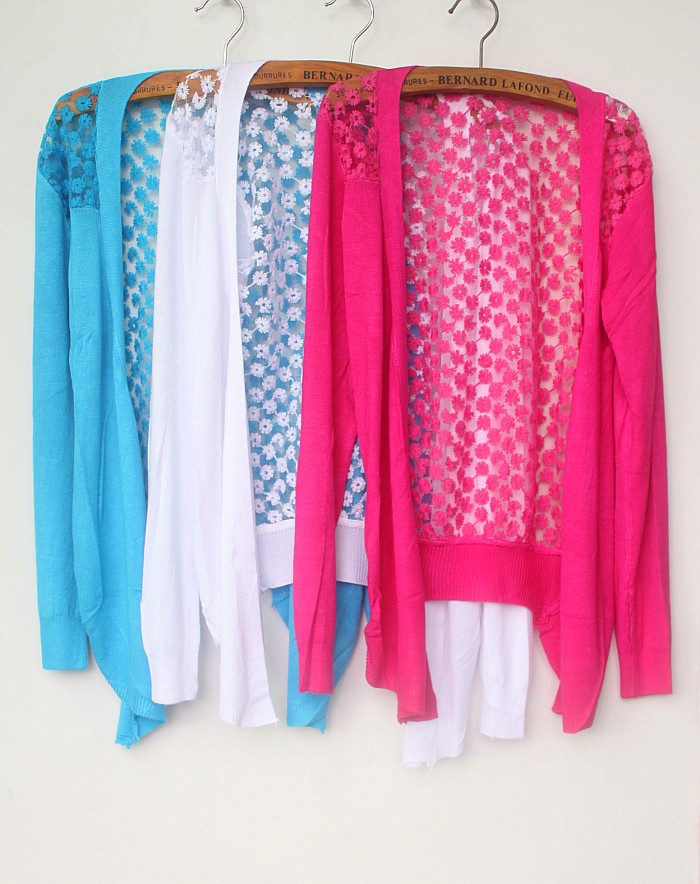 【宝贝名称】后背蕾丝小花开衫【颜色选择】白色、黄色、粉色、橘色、湖蓝、玫红、黑色、西瓜红【面料材质】针织【尺寸详情】均码 衣长:56cm 胸围:80-96cm 肩宽:34-38cm 袖长:56cm【宝贝描述】做工精致,穿着舒适,款式休闲,色彩靓丽,极力推荐哦!!!