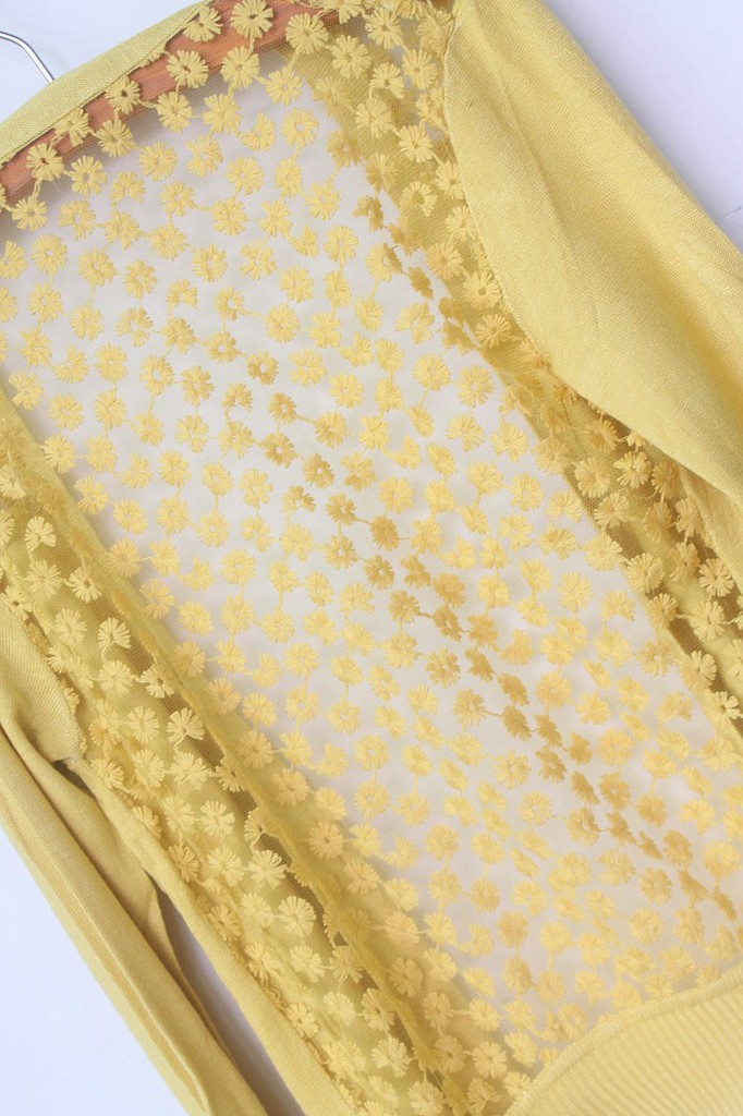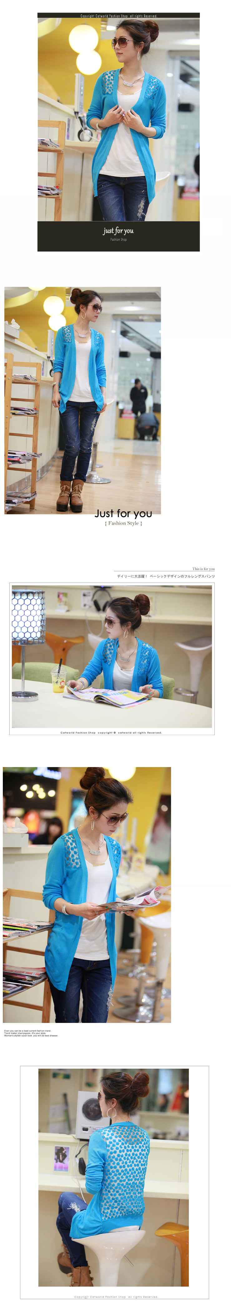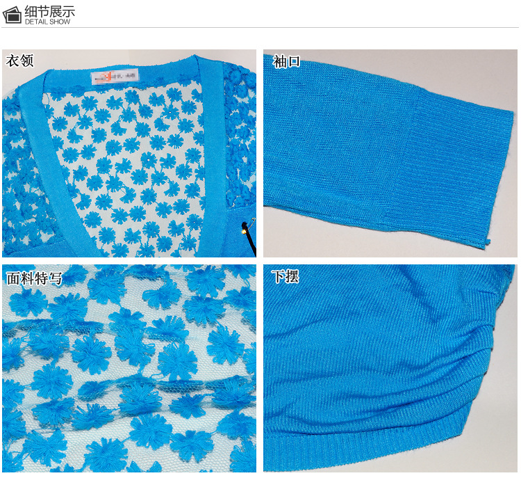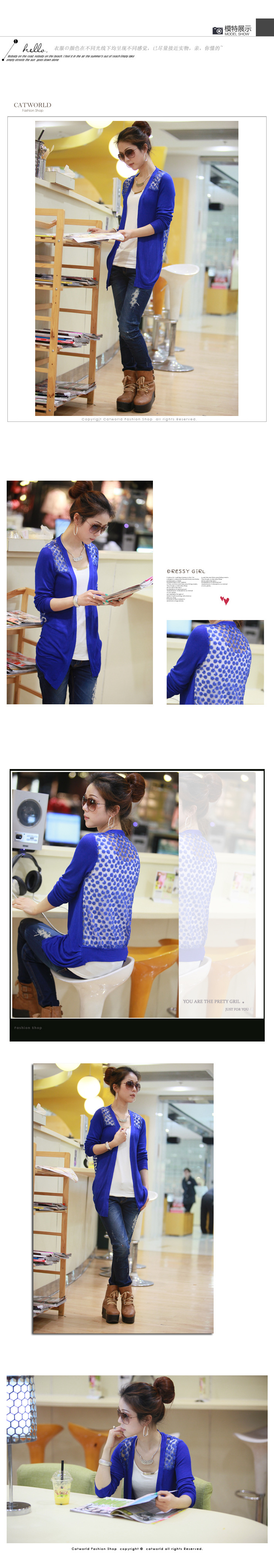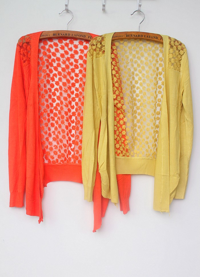 【宝贝名称】后背蕾丝小花开衫【颜色选择】白色、黄色、粉色、橘色、湖蓝、玫红、黑色、西瓜红【面料材质】针织【尺寸详情】均码 衣长:56cm 胸围:80-96cm 肩宽:34-38cm 袖长:56cm【宝贝描述】做工精致,穿着舒适,款式休闲,色彩靓丽,极力推荐哦!!!