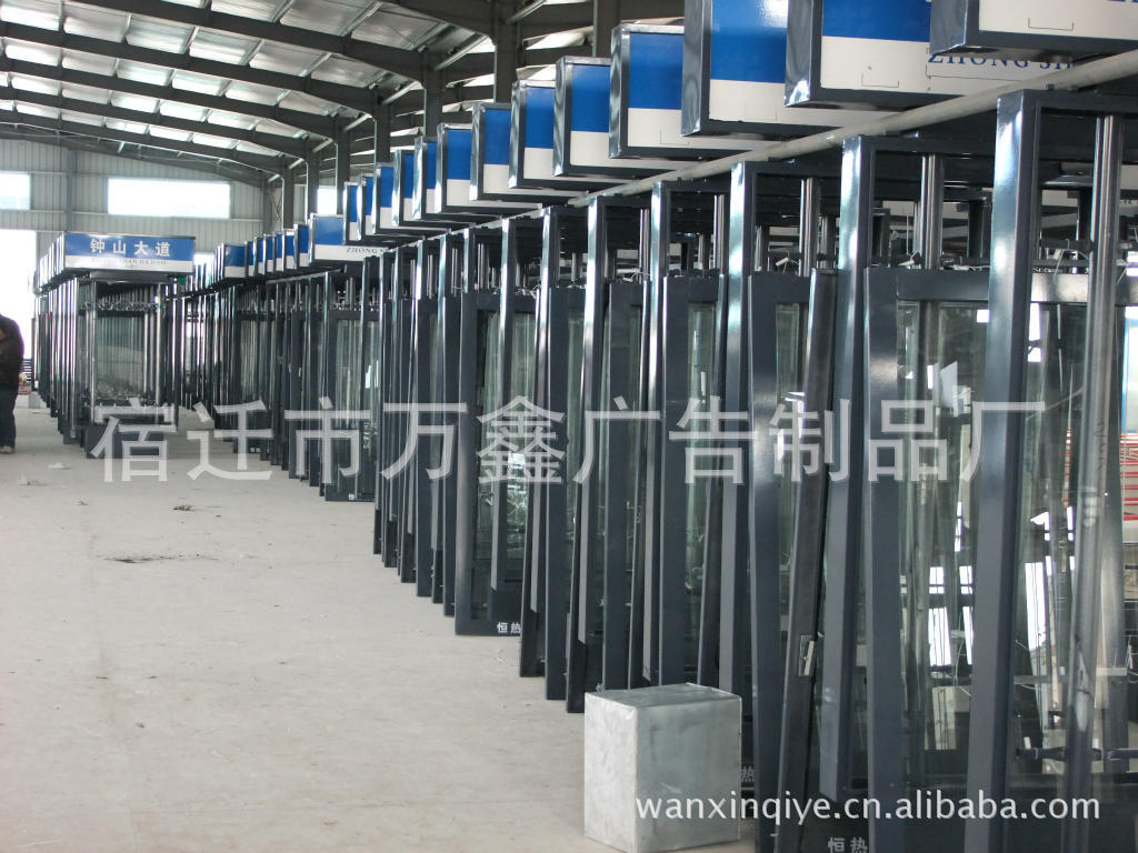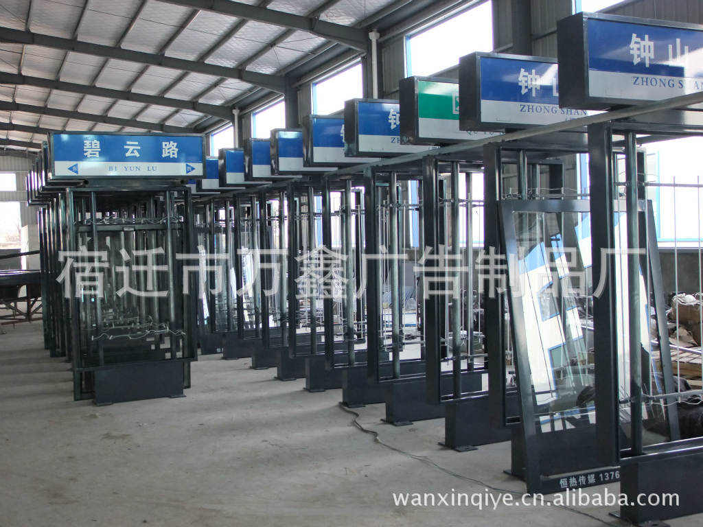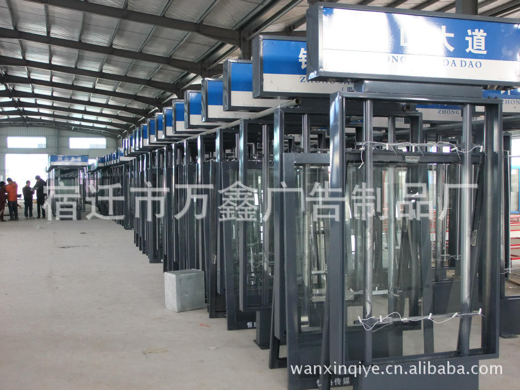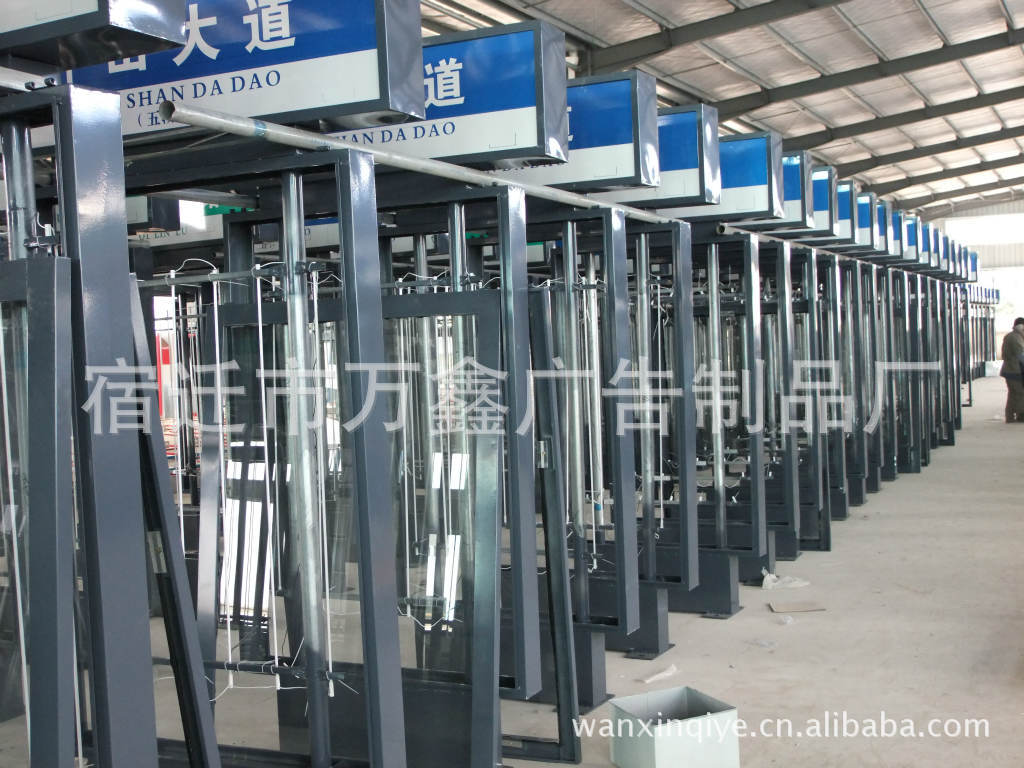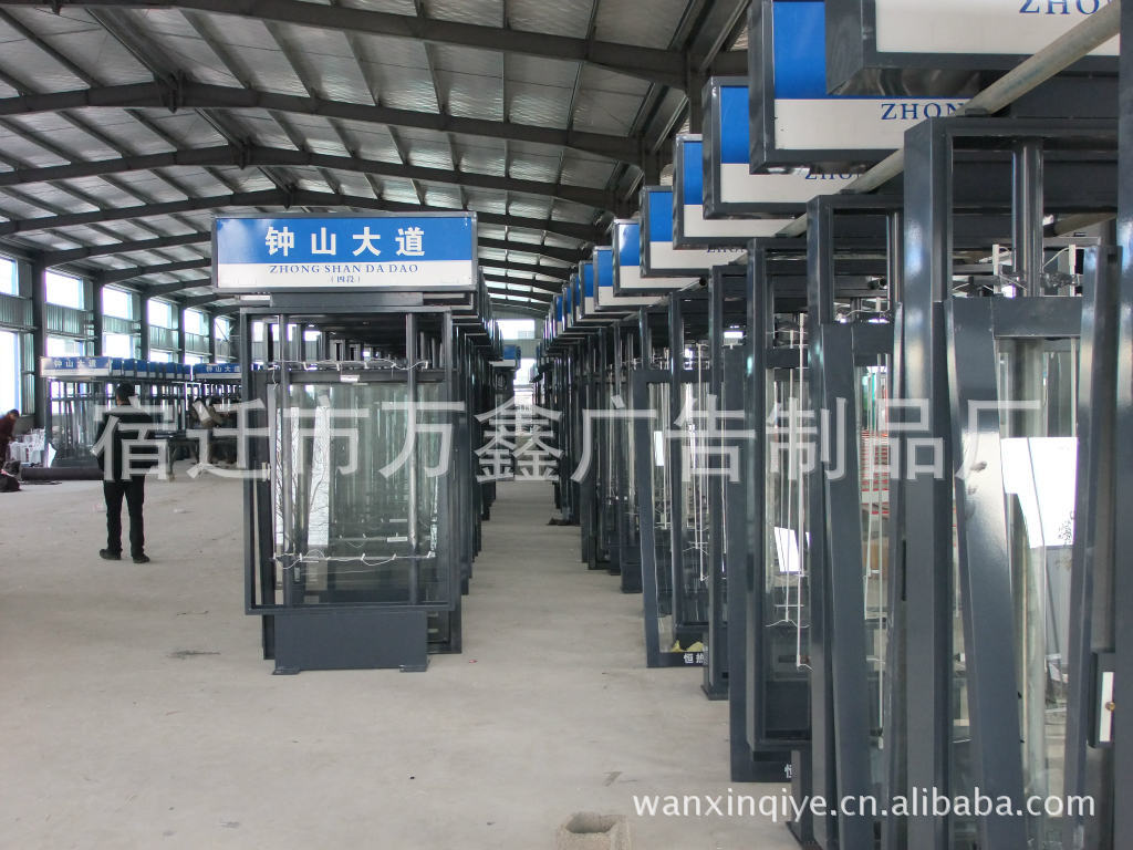 以上是我厂为贵州某城市制作的路牌型广告灯箱。欢迎选购我厂生产的其他产品:银行ATM防护罩,自助终端防护罩,城市阅报栏,滚动灯箱,候车亭,广告垃圾箱等系列新型广告灯箱产品。宿迁市万鑫广告制品厂是一家具有路牌制作,灯箱加工,户外灯箱生产大订单生产能力的品牌企业,企业占地30宇亩,生产面积12000多平方,月灯箱生产能力约为4000台,主要生产产品:路牌灯箱,户外灯箱,阅报栏,候车亭为,阅报栏,路,指路牌灯箱,特色产品:ATM防护罩 银行旋转资料架 花草保护标识牌牌路牌灯箱链接