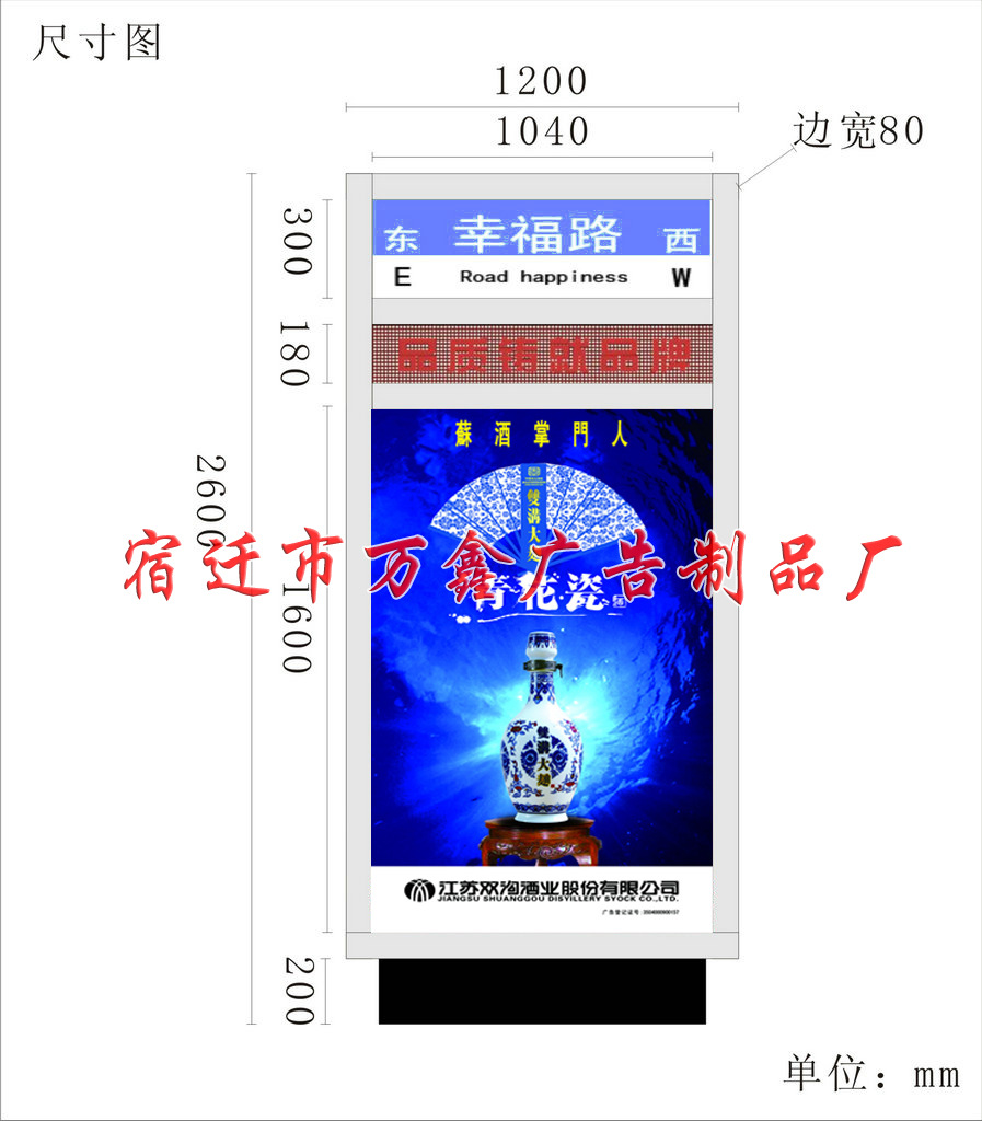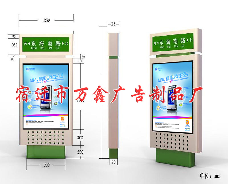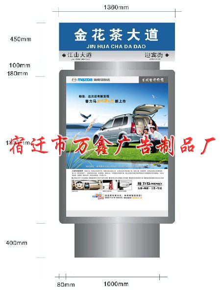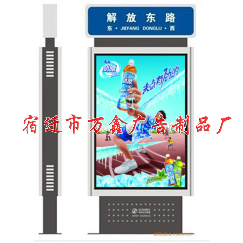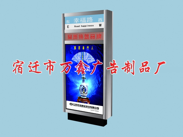 宿迁万鑫广告制品厂位于风景秀丽的京杭大运河畔、江苏省宿迁市开发区东区,企业主要从事各类路牌灯箱/指路牌灯箱/路广告灯箱/指路牌滚动灯箱/多功能路/不锈钢路牌灯箱/喷塑指路牌广告灯箱全自动换画灯箱,滚动灯箱,广告垃圾箱制作 、 广告垃圾箱,果皮箱灯箱, 小区灭蚊灯箱、社区灭蚊灯箱,小区广告灯箱, ATM自动取款机防护罩、户外灯箱广告,滚动换画灯箱 滚动灯箱、不锈钢滚动灯箱、异型灯箱 圆型灯箱 异型户外广告灯箱、换画灯箱控制系统、滚动灯箱配件,换画灯箱配件的开发、生产和销售的专业企业。自行设计制作换画灯箱及附件,具有成熟的技术力量和完善的售后服务,公司产品共分为四大系列二十余种滚动换画灯箱产品。我厂的多功能卷动式灯箱和全自动换画广告灯箱已经走向全国市场,“以技术赢得天下、以服务诚信未来”的营销方针走向市场。万鑫广告热烈欢迎你们来电咨询。