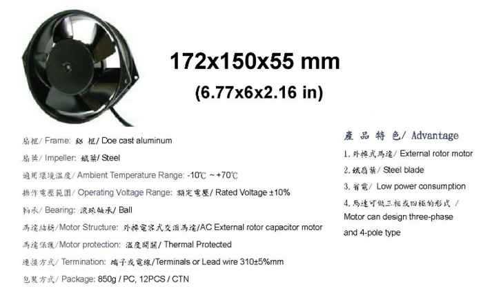 为弘的交流风扇采用外转子电机具有最高的风量、,最高静压、较低的电流,最高的效率和竞争价格的最高水平。多项专利证明我们的设计能力。我们可以协助客户解决问题关于热量。与此同时,代理人想要的。主要产品:全金属ac风扇(防紫外线,Endure-high温度、钢叶轮)、外转子交流风机、轴流风机、工业扇、排气风机、冷风机、电机设计(排风扇、浴室风扇、工业扇)。