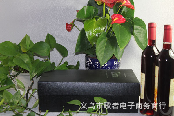 这是一款黑色仿蜥蜴纹的特种纸双支纸质酒盒,特种纸因为其表面的特殊工艺,所以几乎不能再进行比如覆膜,印刷的工艺处理。对于特种纸最常见的莫过于烫金,烫银,丝印等,亲爱的您可以将你们公司的LOGO等以这种方式做上去。