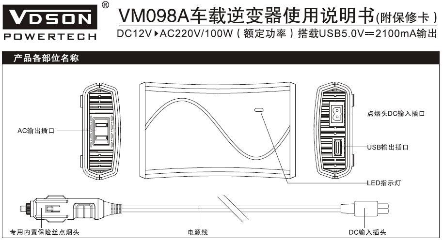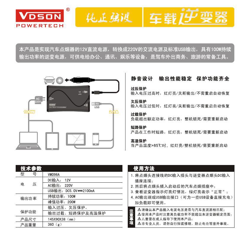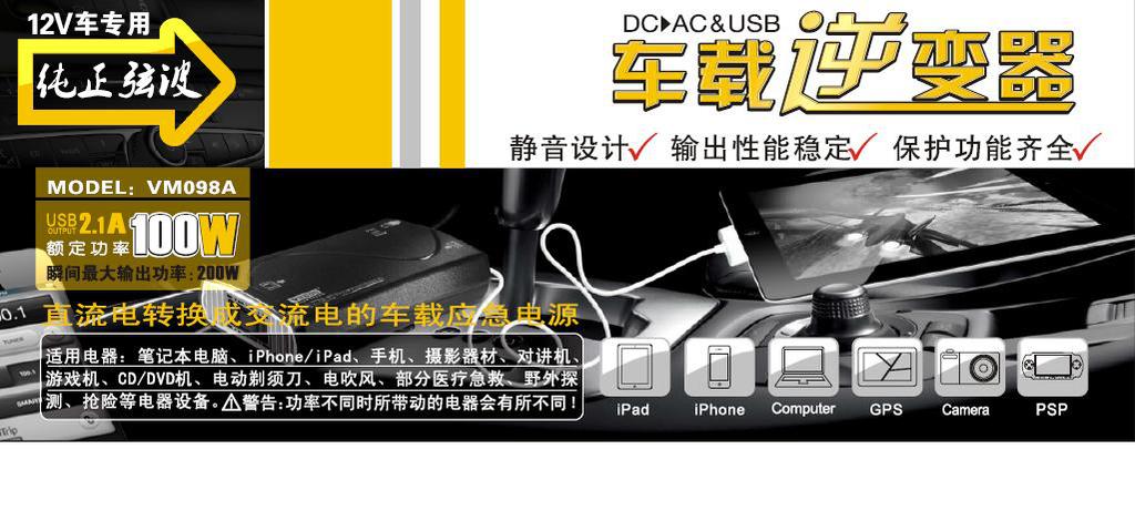 100W持续输出功率!USB输出2.1A大电流!静音设计,各种保护功能齐全,安全可靠!