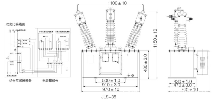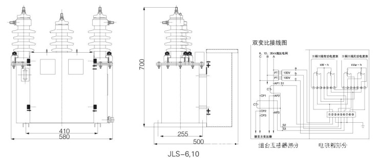 本产品主要由组合互感器和电度表箱两部分组成,组合互感器由两台或三单相电压互感器和电流互感器组成,用25#变压器油作绝缘介质,一、二次出线端均用瓷套管安装在面板上。电度表箱装在组合互感器侧面,由一只有功电度表和一只无功电度表组成,具有计量精度高、重量轻、安装方便、防窃电等优点。