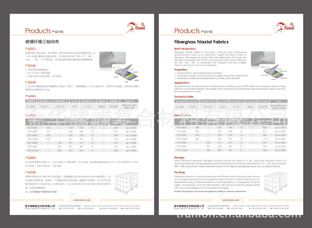玻璃纤维三轴向布是一种不卷曲,具有多轴向和多结构的增强材料。每一层之间通过聚脂纱线缝合而成。可以通过使用多个方向(0°,90°,+45°,-45°)的不同组合,也可选加短切层或薄毡等材料缝编而成。