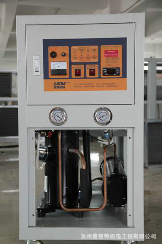 5、工业冷水机多功能操作面板上装有电流表,控制系统保险,压缩机开关按钮,水泵开关按钮,电子温控制器,各项安全保掮故障灯,机组启动运转指示灯,操作简单,使用方便。工业冷水机机组配置:配置单片式控制系统,内置压缩机干燥过及膨胀阀,维修手阀接口等装置,确保了机器可靠安全运行,方便了保养维修。