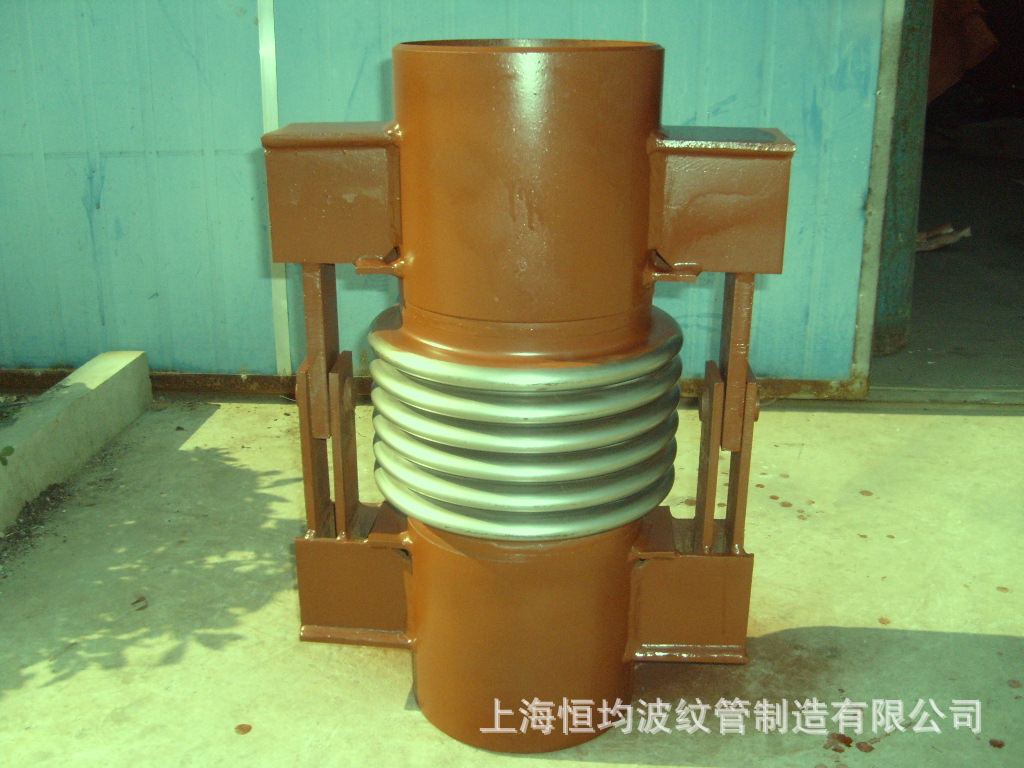 是由一波纹管、平衡环及两对与平衡环和端管相连的铰链板组成的挠性部件。 单式铰链波纹膨胀节的性能特点: 单式铰链型波纹膨胀节通过其角度的变化来吸收管线、输送通道或容器等沿其轴向方向因热膨胀或收缩所引起的角向位移。通常两件或三件组合使用,补偿量与两件产品间距离成正比,其优点是体积小,重量轻,产品压力推力由铰链构件承受, 角向铰链波纹补偿器可以补偿管线在任意方向的角位移。 单式铰链波纹膨胀节的安装说明: 1、膨胀节上的小拉杆只作为运输、安装和“冷紧”用,安装完毕后必须将其拆除。 2、当膨胀节角变形较大或系统工作压力较高时,推荐产品在安装时进行冷紧,冷紧的优点主要在于改善膨胀节及管线的工作稳定性。 3、安装时注意膨胀节铰链转动平面,必须与位移平面一致。 单式铰链波纹膨胀节的应用范围: 主要应用于各种复杂管系,补偿管系的角向位移,如L型管道、Z型管道、U型管道等。 |