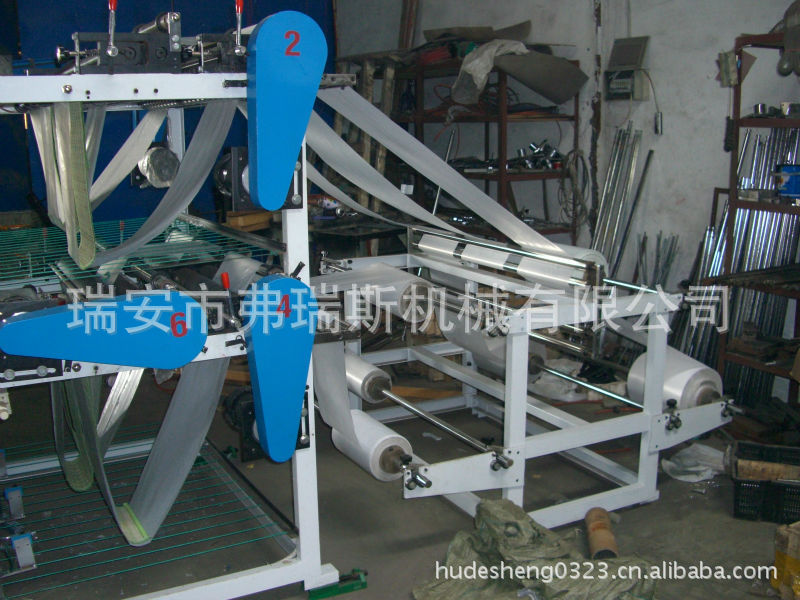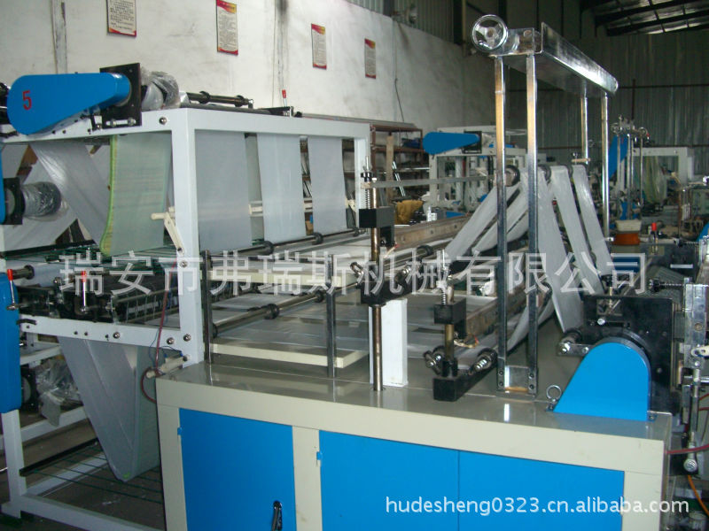 FR-DF-900-1200双层六线底封制袋机,他具有光电自动跟踪,微电脑定长,高限位停机,自动计数,到数报警,补偿精度高,制作的袋子整齐,误差小,整机自动化程度高,是生产白袋、色袋、平口袋、背心袋等各种塑料软包装袋的理想机械。