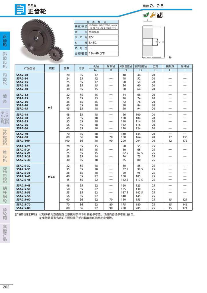 精度等级:JIS B 1702-1 N8 级 (*1) 齿面硬度:(HB194以下) 压力角:20°材料:S45C
