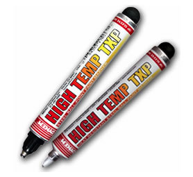 High Temp TXP:Features a stainless steel roller ball tip and a rubber pressure bulb to control paint flow. The TXP is designed to permanently write on dirty, oily, greasy or rough surfaces. The unique design allows you to mark at any angle, upside down and even underwater. The specially formulated oil-based paint withstands extreme conditions. Drying Time: 25 - 30 minutes