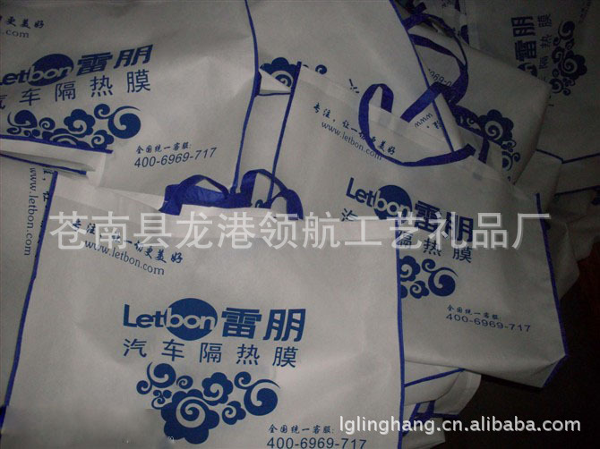 苍南县龙港领航工艺礼品厂专业生产销售无纺布袋、覆膜无纺布袋,镭射无纺布袋、环保无纺布袋、环保袋、牛津袋子,礼品袋、超市购物袋、服装袋、化妆品袋、文具袋等各类袋子。可根据客户的要求,从产品设计、产品印刷、产品制作实行一条龙生产。从来稿、制版、生产至货物运输,本公司提供一站式服务。公司秉承“重合同,守信用”的宗旨,并奉行服务第一,诚信为本的经营理念,热忱欢迎国内外客商光临洽谈!