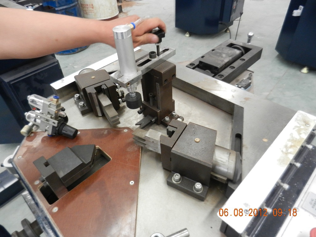 ○组角前,在两个被联接的型材腔内放一公用角码,定位夹紧后,两个液压驱动的冲头强力冲向角码的凹槽处,使型材外壁产生永久性的冷变形