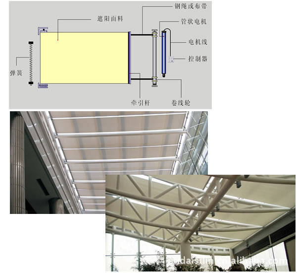 弹簧卷管里预紧的弹簧卷面料。面料的另外一端有牵引杆。马达卷管上安装有左旋和右旋成对的2个卷绳器。卷绳器上固定牵引钢丝,而钢丝通过卷拉固定在面料牵引杆上的牵引滑轮。马达转动拉动牵引钢丝,克服弹簧卷管内弹簧的扭力,将面料拉出。马达反转,钢丝松动,弹簧卷管在弹簧扭 力的作用下,将部分面料卷回到弹簧卷管上,绷紧面料。这样,在马达卷管和弹簧卷管的共同作用下,完成面料的收放动作,起到遮阳调光的功能。该系统可以用开关、遥控或者智能控制方式。