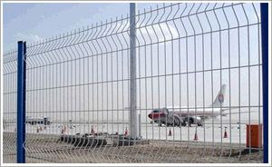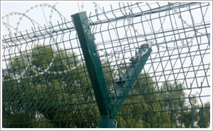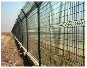 机场护栏网又称作“Y型安全防御护网”,是由V型支架立柱加强型焊接片网,安全防盗连接件和热镀锌刀片刺网组成强度和安全防御性级别很高。近年来被广泛应用在机场,军事基地等高安全场所。 注:如果在机场护栏网顶部加装刀片刺丝、刀片刺网后又很好的增强了安全防护性能。采用电镀、热镀、喷塑、浸塑等防腐形式,具有很好的抗老化、抗晒、耐腐蚀等特点。其产品造型美观、花色多样,既起到围栏作用,又起到美化作用。由于具有安全性高、防攀爬能力好,网片连接方式采用特制SBS紧扣件,有效防止人为的破坏性拆卸,横向四道折弯加强筋,使网面强度显著增加。 材质:优质低碳钢丝。 规格:采用5.0mm高强度低碳钢丝焊接。 网孔:50mmX100mm,50mmX200mm。 网片中带有V型加强筋,可大大增强围网的抗冲击力。 立柱为60X60的矩形钢,顶端焊有V型之架。或者采用70mmX100mm的挂式连接立柱。产品均为热镀锌后采用高质量的聚酯粉末静电喷涂,采用国际流行的RAL颜色。表面处理:电镀、热镀、喷塑、浸塑。 优点:1. 具有美观、实用、方便运输和安装的特点。 2. 要以在在安装时地形适应地形,与立柱连接位随地面起伏可上下调整; 3. 在桥梁护栏网的横向加装四道折弯加强筋,在整体成本增加不多的同时,使网面强度和美感显著增加,是目前国内外最受欢迎之一。 主要用途:机场封闭 、私人地域、军事重地、 场区围网、 开发区隔离网使用. 制作工艺:预直丝、裁剪、预弯、焊接、检验、置框、破坏性实验、美化(PE、PVC、热浸)、包装、入库