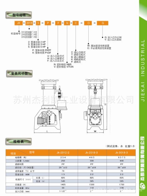 杰凯工业设备有限公司是一家专业生产、销售化学药液过滤机及耐酸碱泵浦之企业。我们拥有十余年防腐泵与化学药液过滤机的研发及生产经验和技术、技术力量雄厚、设备、工艺先进、检测设备齐全。 企业致力于不断增加产品品种和提高产品质量,自主模具开发与注塑,并结合国外先进技术,坚持“质量第一,用户第一,信誉第一”的原则,让客户使用到更加优质及人性化之产品。 企业现已形成了完善的售前、售中、售后服务体系。在全国建立了广泛的销售、服务网络,为客户提供及时、满意的服务。所生产之产品广泛应用于电镀、PCB、LED、连续电镀、化工、医疗、环保及涂装领域。专注、专业、真诚、守信;您的需求,我们来做到;我们的提高,有赖于您的支持与建议! 我们将以信守合约、价格合理为宗旨,真诚与您携手合作,做出我们更好的产品,以答谢新老客户的厚爱。 主营:直立式耐酸碱泵、耐酸碱泵、立式耐酸碱泵、可空转直立式耐酸碱泵、自吸式耐酸碱泵、耐酸碱自吸泵、耐酸碱立式泵、自吸式磁力泵、立式自吸泵、液下泵、不锈钢液下泵、耐腐蚀液下泵、长轴液下泵、不锈钢离心泵、不锈钢耐腐蚀离心泵、不锈钢磁力泵、耐腐蚀磁力泵、进口磁力泵、耐酸碱潜水泵、过滤机、化学镀过滤机、泵用过滤器 杰凯工业设备有限公司是一家专业生产、销售化学药液过滤机及耐酸碱泵浦之企业。我们拥有十余年防腐泵与化学药液过滤机的研发及生产经验和技术、技术力量雄厚、设备、工艺先进、检测设备齐全。