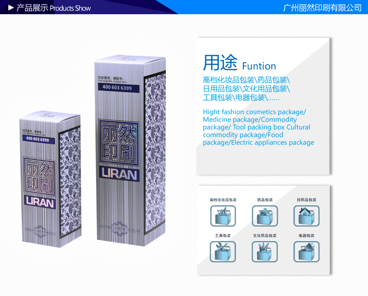 广州市丽然印刷有限公司成立于2004年4月,注册资金500万元,总资产达4000万人民币。是一家专业从事化妆品、日用品、食品、电子类产品等包装盒的印刷生产企业。