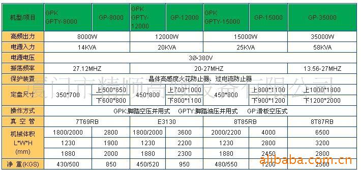 ★敬请注意:本公司也有制造0.1-100KW之高频塑胶熔接设备、高频感应加热设备、高频烘干设备、工频加热设备、热压定型机械、热转印机械等各种相关塑胶之加工机械:优质的售后服务及真空管 变压器 电容 等各种零配件的批发零售; 在福建、广大 、浙江 、上海、江苏 、河北等大中城市均设有办事处,欢迎致电总公司索取资料。