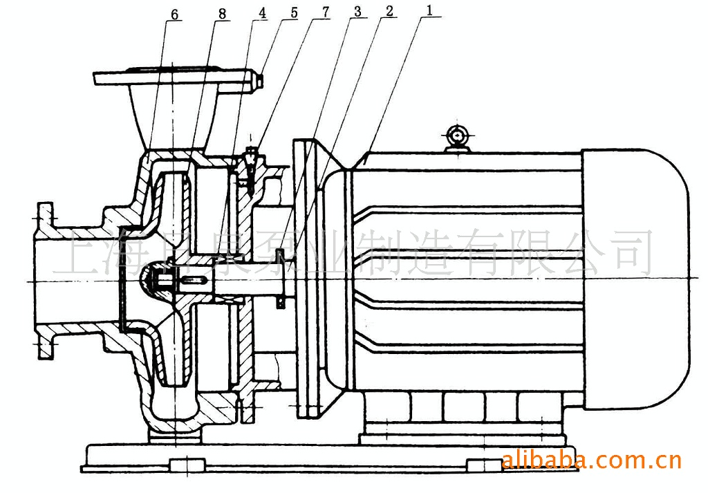 1 电动机:直接与水泵联接传送动力,采用名牌电机。 2 泵轴:与电机同轴,为电机加长轴,确保了轴的同心,使泵运转平稳。无噪音和振动现象,采用镀铬处理,增强了使用寿命。 3 挡水圈:防止因密封漏水而使电机进水。 4 机械密封:采用不锈钢、碳化钨、氟橡胶等材料制成。平衡式耐高温。高压机械密封,运行寿命长,不渗漏,对轴无磨损,不积水垢,保证工作环境的整洁。 5 取压塞:可安装压力表直观监控泵的正常高效运行 6 泵体:压出塞和吸入室采用优秀水力模型设计而成,既美观又高效,设有安装底脚,便于安装和运行稳固。 7 放气塞:灌泵时排净泵内空气,保证了泵的正常启动。 8 叶轮:采用先进的水力模型设计而成,具有高效率,可靠性好等特点。 六、起动与停车 起动前准备: 1、试验电机转向是否正确,从电机顶部往泵看为顺时针旋转,试验时间要短,以免使机械密封干磨损。 2、打幵排气^使液体充满整个泵体,待满后关闭排气阀。 3、检查各部位是否正常。 4、用手盘动泵以使润滑液逬入机械密封端面。 5、高溫型应先逬行预热,升溫速度50℃/小时,以保证各部受热均匀。 起动: 1、全开进口阀门。2、关闭吐出管路阀门。3、起动电机,观察泵运行是否正桷。4、调节出口阀幵度以所需工况,如用戶在泵出口处裝有流靈表或压力表,应通过调节出口阀门幵度使泵在性能参数表所列的颔定点上运转,如用戶在泵出口处装有流量表或压力表,应通过调节出口阖门幵度,测璗泵的电机电流,使电机在额定电流內运行,否则将造成泵超员荷运行(即大电流运行)至使电机烧坏。调正好的出口阀门幵启大与小和管道工况有关。5、检査轴封泄漏情况,正常时机械密封泄漏应小于3滴/分。6、检查电机、轴承处溫升≦70℃。 停车: 1、高溫型先降溫,降溫速度〈10℃/分,把溫度降低到80℃以下,才能停车。2、关闭吐出管路阀门。3、停止电机。4、关闭进口阀门。5、如长期停车,应将泵內液体放尽。 七、泵的维护 1、运行中的维护: (2)进口管道必须充满液体,禁止泵在汽蚀状态下长期运行。(2)定时检查电机电流値,不得超过电机颔定电流。(3)泵进行长期运行后,由于机械磨损,使机组噪音及振动增大时,应停车检查,必要时可更換易损零件及轴承,机组大修期一般为一年。 2、机械密封维护: (1)机械密封润滑应清洁无固体颗粒。(2)严禁机械密封在干磨情况下工作。(3)起动前应先盘动泵(电机)几圈,以免突然起动造成石墨环断裂损坏。(4)密封泄漏量允差3滴/分。否则应检查。 |