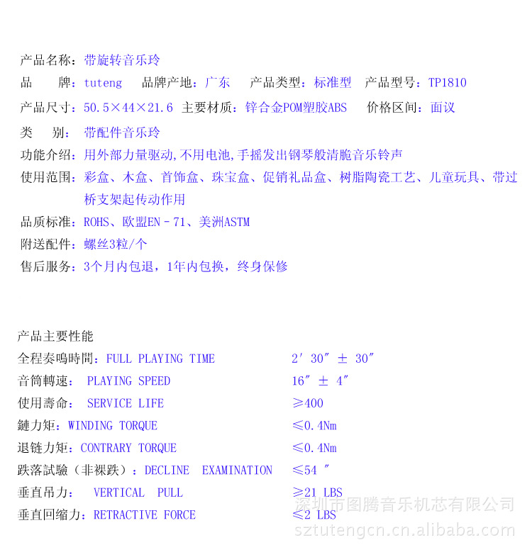 深圳市图腾音乐机芯有限公司是一家专业开发、生产、销售八音琴、音乐机芯、玩具配件等为一体的公司,可提供上千首音乐铃八音琴曲名——圣诞、儿歌、流行歌曲,并可根据客户要求,提供母带进行录音、研发。 欢迎来图、来样开发、生产。