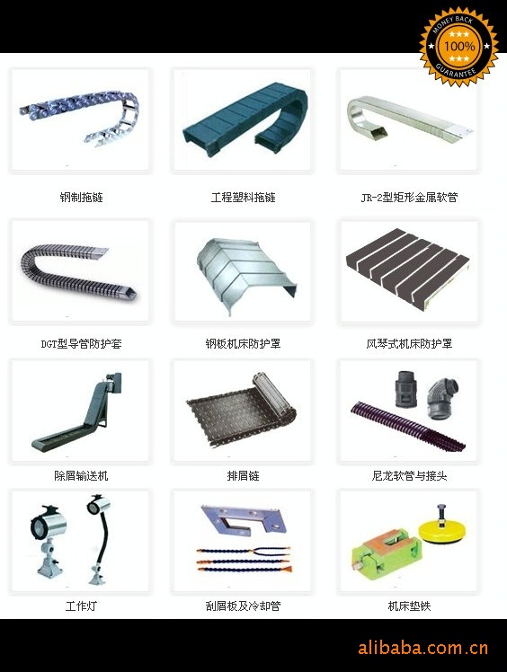 主要产品有钢板式防护罩、柔性风琴式、盔甲式、自动伸缩式防护罩,钢制拖链、工程塑料拖链、DGT型导管防护套、矩型金属软管,排屑输送机、排屑链,尼龙软管及接头、耐高温伸缩风管、吸尘管、可调塑料冷却管,刮屑板、行程槽板,机床减振垫铁,操作件等数控机床附件产品。