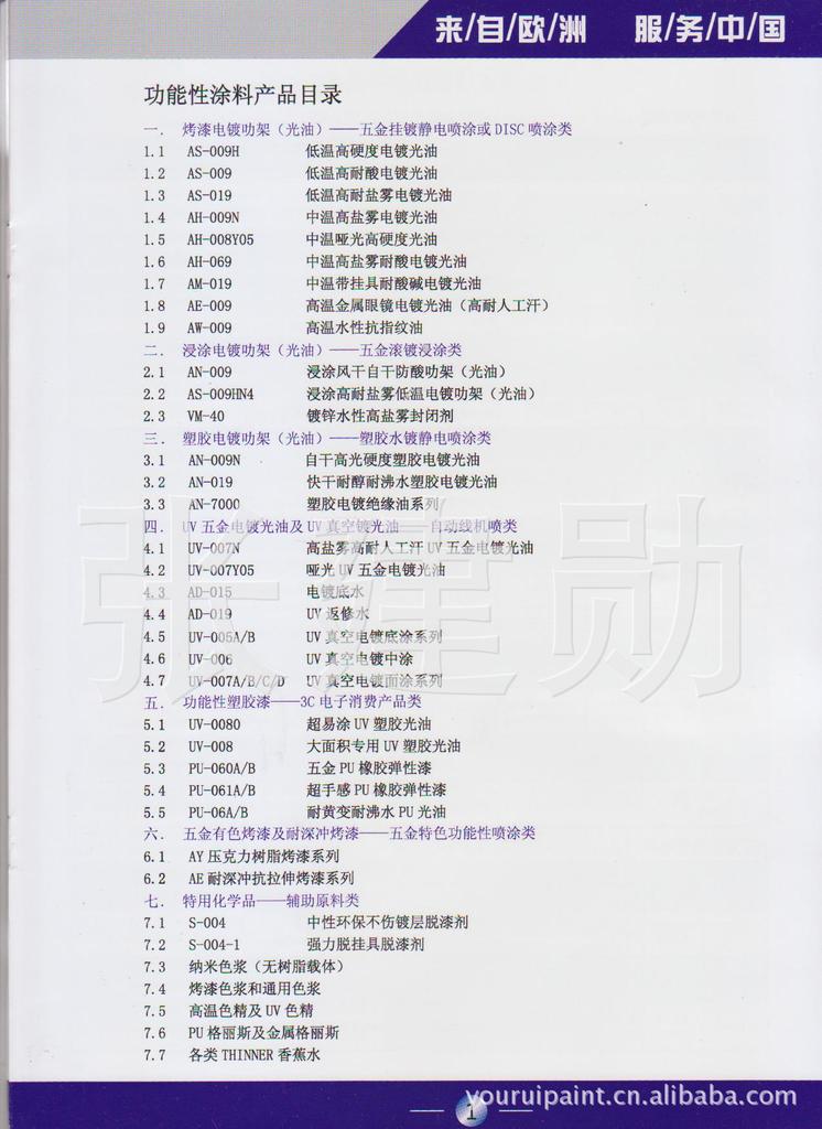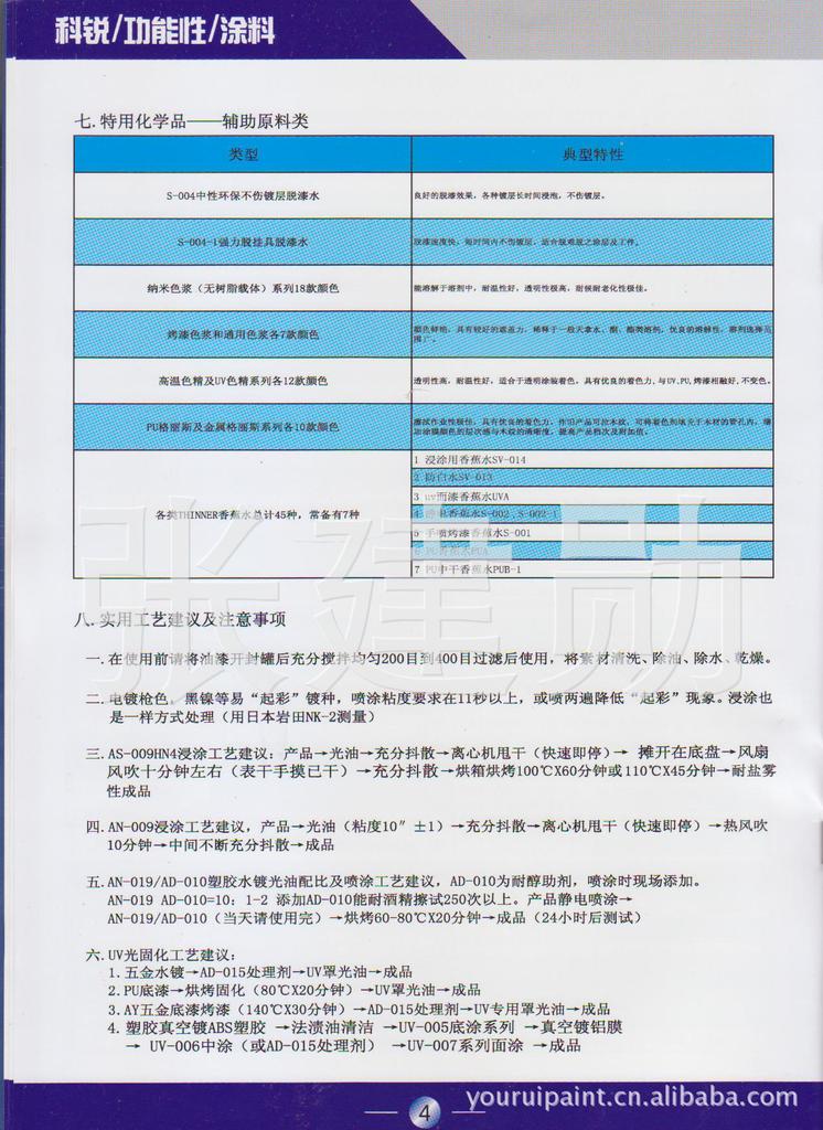 产品介绍:水性AW009(水叻架)采用改性丙稀酸共聚树脂(不含有害之增塑物料,环保型)直接纯净水稀释而成,特别使用在蓝、白、彩锌、仿金、真金、青铜等镀种。此产品符合美国”EN71 Part3”、欧盟“ROHS”2002/65/EC全球无毒标准(SGS检测报告)。