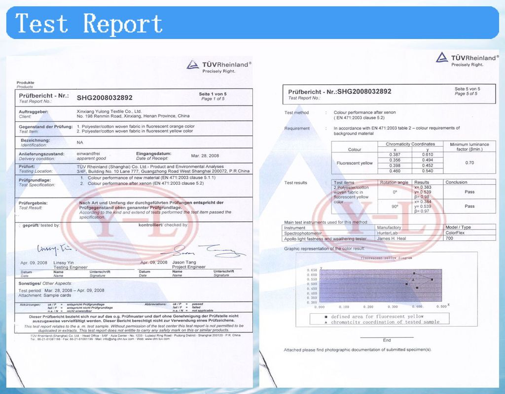 荧光布:我厂生产的荧光涤棉交织布(涤盖棉梭织面料)正面为涤,便于染出鲜亮的色彩,背面是高强力棉,强力大,贴身舒适,达到了EN471标准,具有证书。产品主要有荧光橙、荧光黄、荧光红三种颜色,克重在180—310克之间,有斜纹与缎纹,涤棉配比有正比也有倒比例,是很适合作为工装面料的梭织布,同时又在此面料上开发了防静电、阻燃等功能,另外生产的荧光牛津布、涤纶纱卡也具有EN471荧光证书,并且在此面料上也开发了防静电,阻燃和防水透湿等功能。