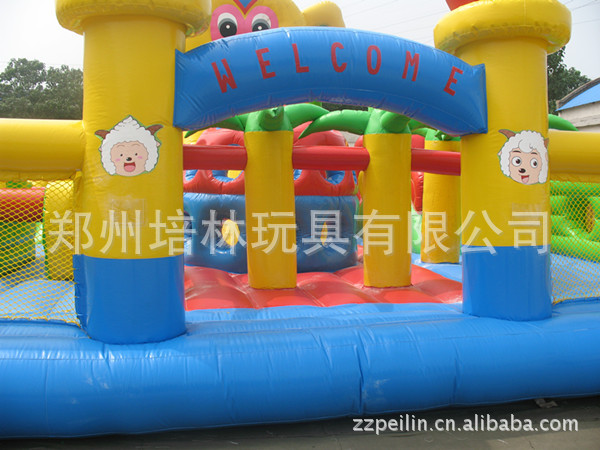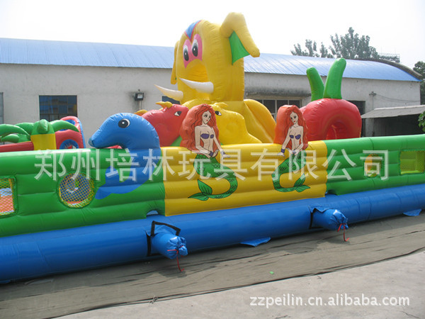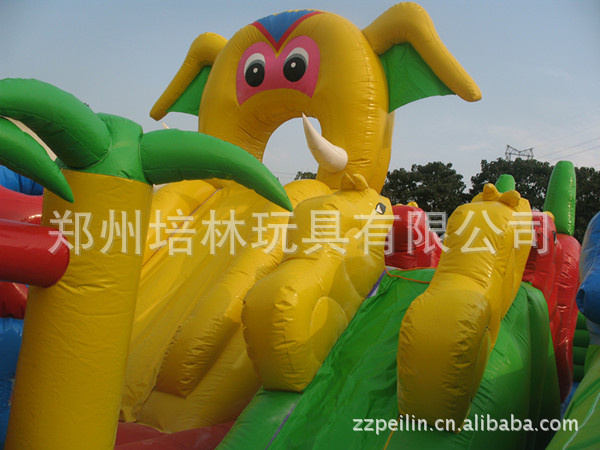 充气玩具属新一代的娱乐设施,根据儿童的特性设计,它内含滑梯,各式各样的动物造型,有丰富的娱乐项目,深受孩子们的喜爱。它具有安全性,综合性,可观赏行,新颖性,色彩鲜艳,经久耐用。通过科学的立体组合,采用超强的防水布制作而成,是一种综合性超强的娱乐乐园。游戏者通过翻,滚,爬,摇,晃,跳,钻等新奇的活动方式,达到开发智力,锻炼身体,愉悦身心的目的。本产品因其随意性和无动力装置受到买家的欢迎,安全可靠,管理简单,维修方便。
