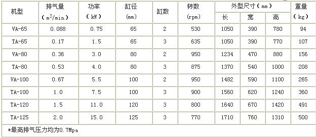 单级压缩风冷系列(二年保固产品)单级风冷往复式空压机的最高使用压力在0.7Mpa左右,如您所需要的工作压力超过0.7Mpa时,建议选购二级压缩风冷往复式空压机