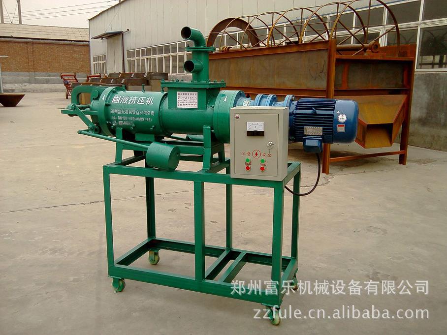 螺旋挤压式固液分离机主要由主机、无堵塞泵、控制柜、管道等设备 组成。主机有机体、网筛、挤压绞龙、振动电机、减速电机、配重、 卸料 装置的部位组成。 其工作过程如下:无堵塞泵将未经发酵的猪粪水泵入机体,在振动电机的作用下加速落料,此时经动力传动,挤压绞龙将粪水逐 渐推向机体前方,同时不断提高前缘的压力, 迫使物料中的水分在边压带 滤的作用下挤出网筛,流出排水管。挤压机的工作是连续的, 其物料不断泵入机体,前缘的压力不断增大,当大到一定程度时,就将卸料口顶开, 挤出挤压口,达到挤压出料的目的。为了掌握出料的速度与含水量, 可以 调节主机下方的配重块,以达到满意适当的出料状态。 使用螺旋挤压式固 液分离机,其自动化水平高、操作简单、易维修、日处理量大、动力消耗 低、适合连续作业。其关键部件选用不锈钢材料制成, 整机重量近半吨且外形尺寸较小,是规模化养猪场理想的固液分离设备, 能大幅度提高固液分离与效益。