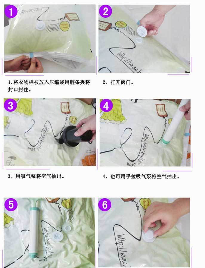 5. 用拉链在封口处来回滑动,确保袋子真正封闭 抽气完成后,移去吸尘器或气泵,盖上防尘盖既可。(用泵的人注意,因为大袋子要抽的时候长点,这时候不用一下子抽完,中间可以停下来,空气是不会进去的。等休息完之后,或者有时间再接着抽气。)