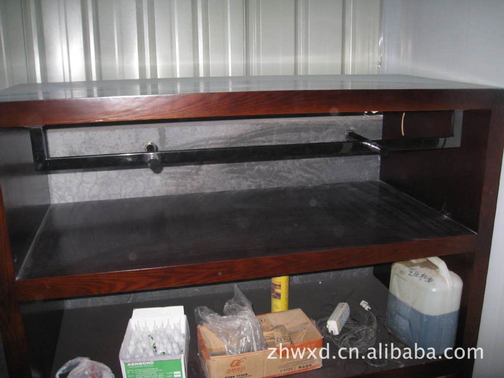 该流水台分高低两个,高台长1.5米,宽0.7米,高0.8米;低台长1.4米,宽0.6米,高0.6米。低台可以放到高台下面。层板是白色烤漆,色泽非常饱满。