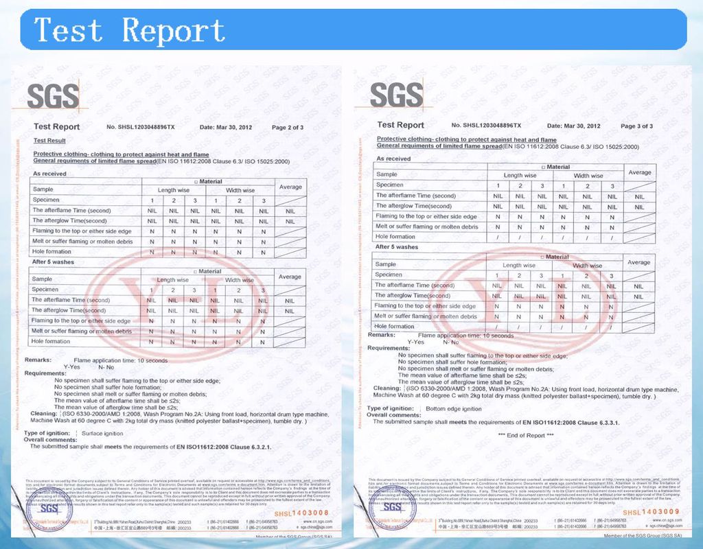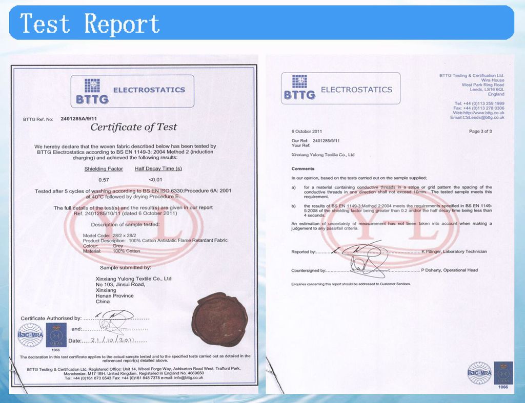 防静电阻燃面料除了具有阻燃性能外,由于在织物内部经纬方向织入了具有导电性能的碳丝纤维,因而使其具有了永久的防静电性能,且该两种功能互不干扰,均可达到各自的功能指标。阻燃性能可达到欧盟的EN11612(原EN531)、EN11611(原EN470-1)、EN533;美国的NFPA2112、ASTM等标准。防静电性能可以达到EN1149标准。