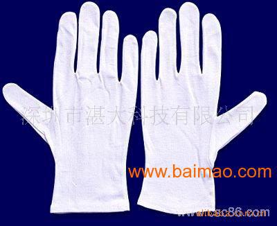 纯棉手套由成匹白色或杂色棉布加工而成,百分百纯棉,吸汗性高,发尘性低,产品统一,穿戴舒适方便,操作灵活自如。湛大手套可有效避免产品受损,达到提高产品质量的目的!接母指,双线车工入,1200双或2000双/袋;12双/打。百分之百纯棉, 本产品由整卷白色纯棉坯布,经漂染、裁切、车缝加工 、翻卷、分级、包 装等一系列工序精工制作而成;纯棉白布面料对拼缝制,吸汗、透气、不掉色、 不脱毛、防尘效果较好。 100%纯棉纤维,弹性适中,加厚纯棉面料、颜色统一色 差小,规格整齐。主要适用于电子厂,珠宝手饰厂,流水线生产过程中员工使用 的作业手套,用于接触产品时轻拿轻放,防汗、防尘、防磨花、防碰撞而损坏产 品,防护手套使用简单,穿戴方便;也广泛应用于五金.家具厂、电子、电子装 配,一般装配,搬运,园艺 .电镀,塑胶等作业员及品管员使用,劳动作业时穿戴使用.