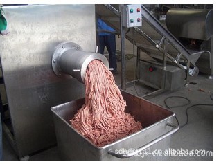 冻肉(非冻肉)绞肉机适应大、中、小型肉食品加工厂,它可将-18℃未解冻(常温)的无骨肉块直接加工成不同径的大小颗粒,为斩拌或搅拌做好前期工作。它是依靠螺杆将料斗箱中的原料肉推到预切板处,通过螺杆的旋转挤压使孔板与绞刀产生相对运转,从而将物料肉切成颗粒状,确保了肉馅的均匀性。它可将块状肉(冻肉)及食品绞至φ6-φ16mm的颗粒,是肉类制品加工的必备设备。