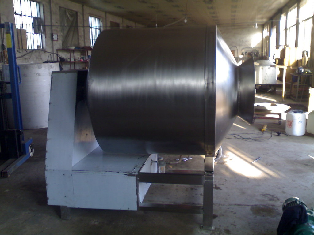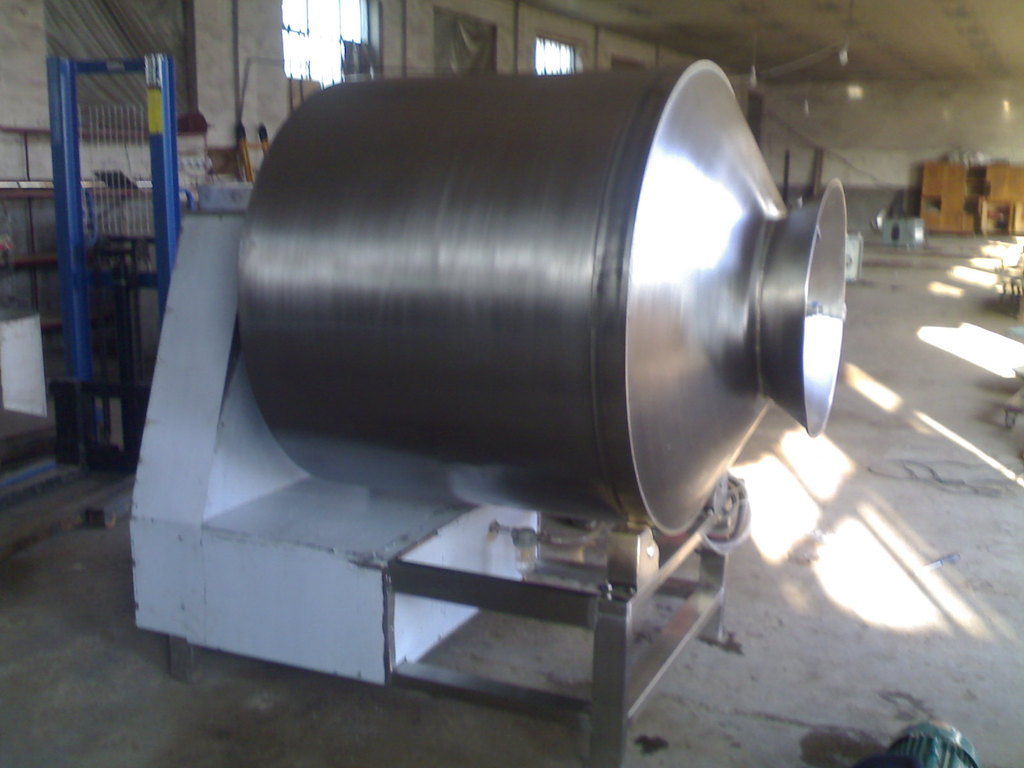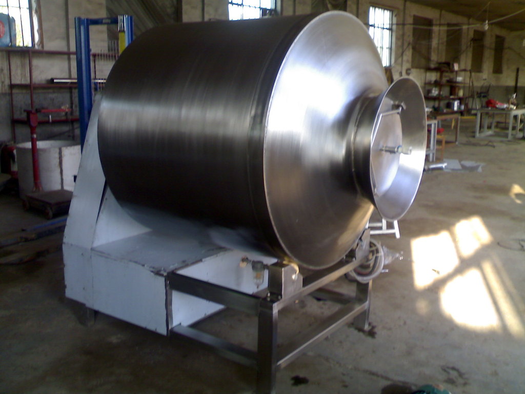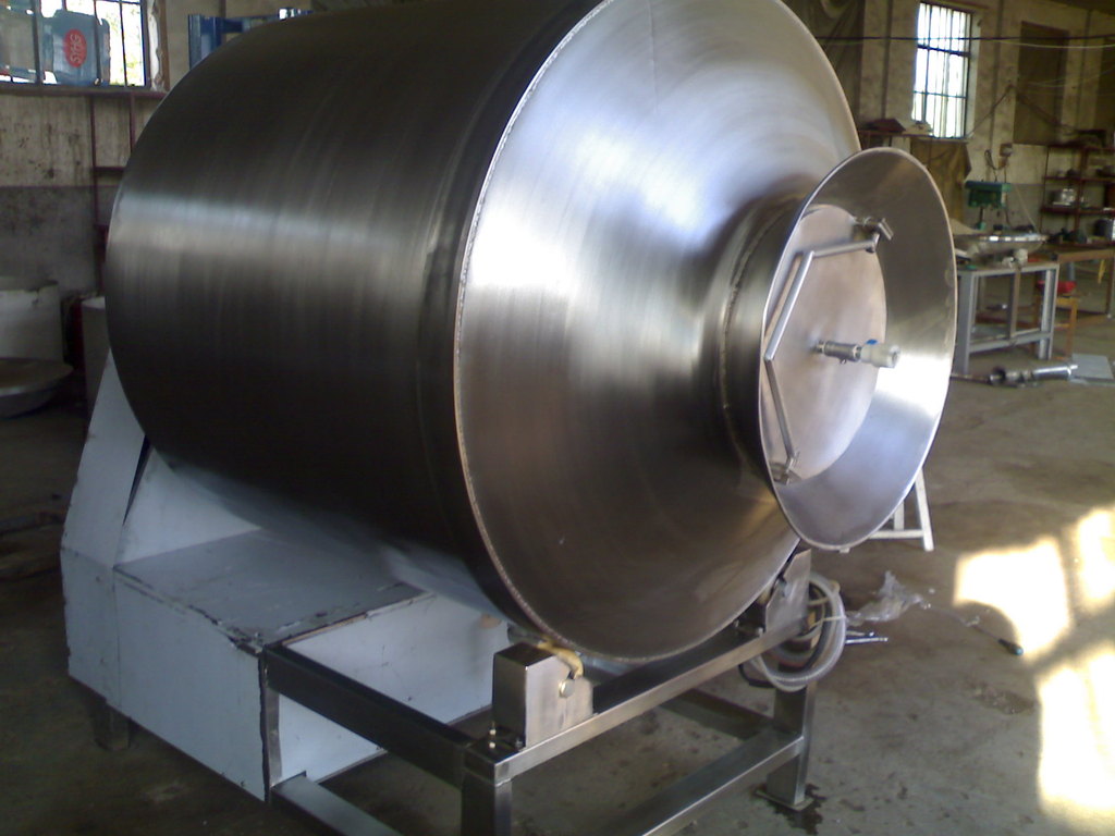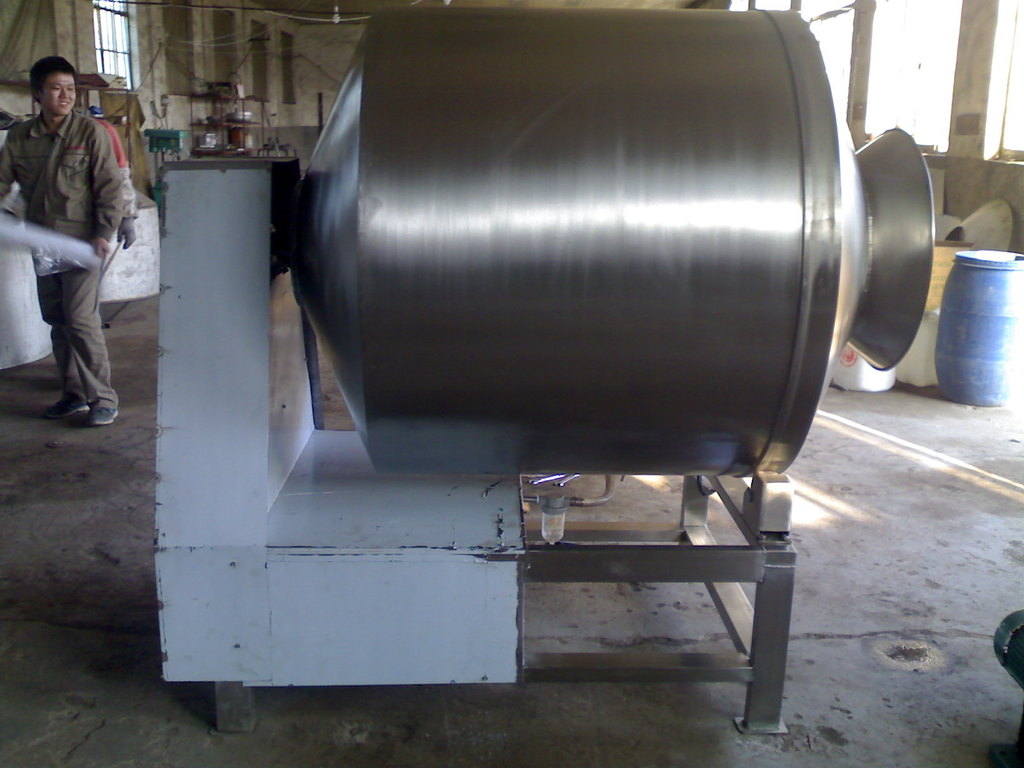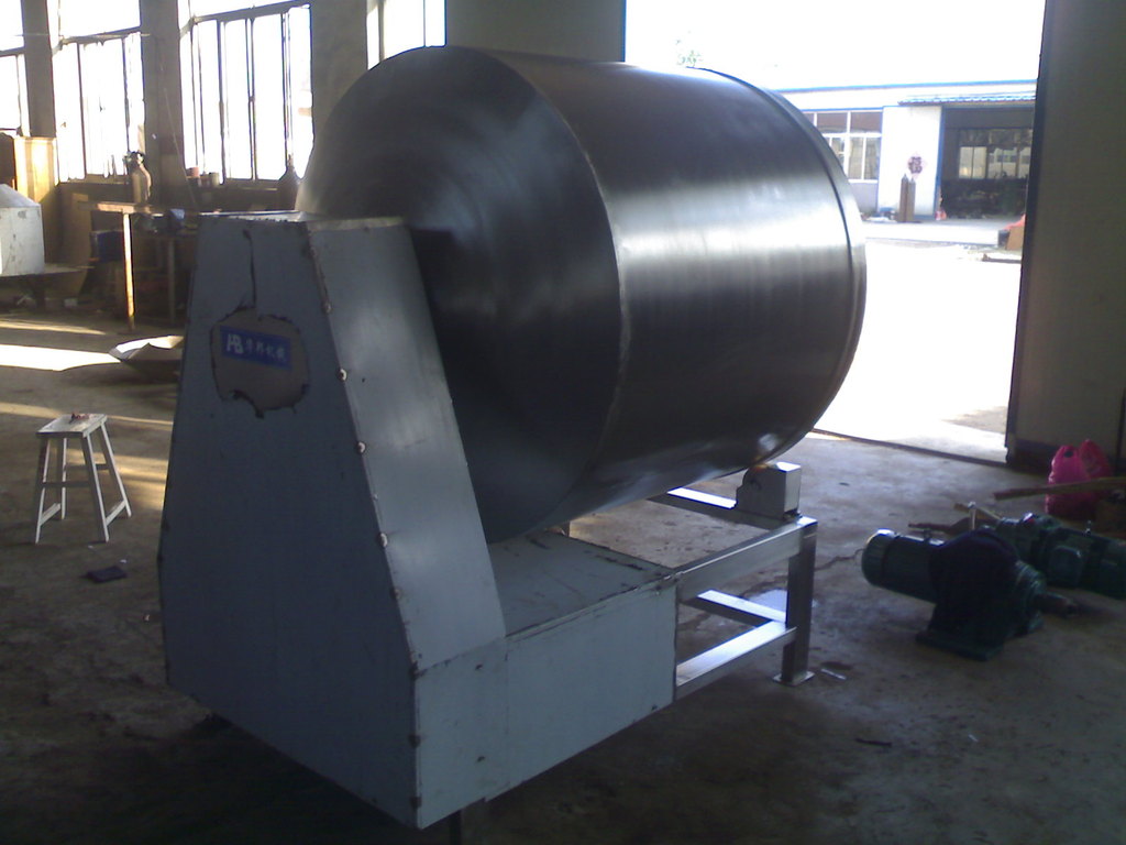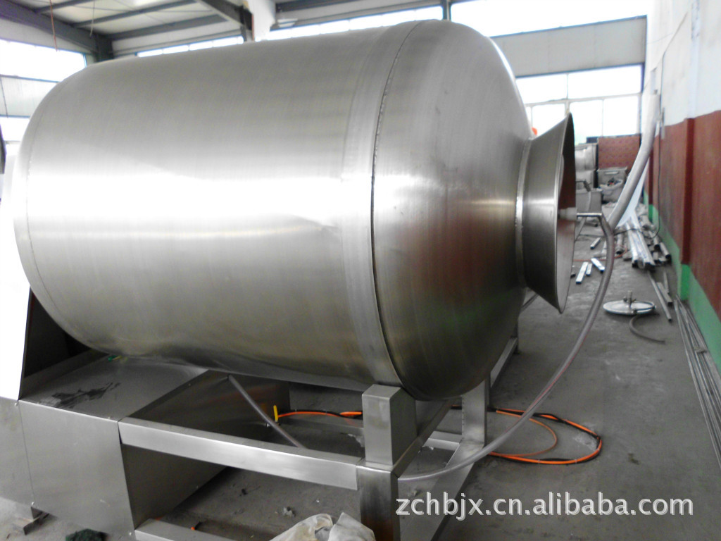 真空滚揉机是在真空状态下,利用物理冲击的原理,让肉在滚筒内上下翻动,相互撞击、摔打,达到腌渍作用,使肉均匀的吸收腌渍,提高肉的结着力及产品的弹性,通过滚揉能使肉体蛋白质分解成水溶性蛋白,易被人体吸收,同时能使添加料(淀粉等)与肉体蛋白质互为融合以达到肉质变嫩,口感好,出口率高。本机具有肺呼吸功能,让产品在滚筒内膨胀、缩小了往复运动,改善了肉组织的结构,提高了切面效果。