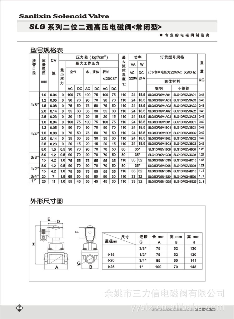 安装:按阀上所标流向箭头,为增强使用寿命和可靠性,最好线圈向上,水平安装