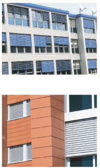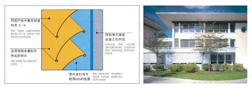 本产品分为50mm和80mm两种规格,可用做户外遮阳和双层幕墙间遮阳。50mm的铝合金百叶帘尤其适合用做生态幕墙和呼吸式双层幕墙间的遮阳。本铝合金百叶帘系统是采用欧洲成熟系统及原材料制作。
