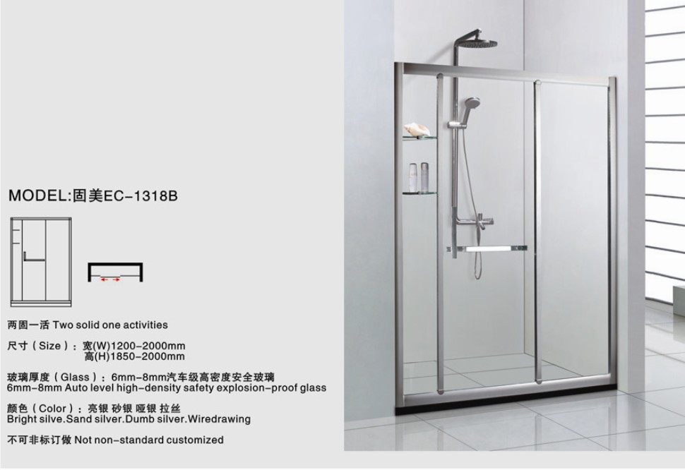 整体淋浴房功能的较多,价格较高,一般不能订做。带蒸汽功能的整体淋浴房又叫蒸汽房,心脏病、高血压病人和小孩不能单独使用蒸汽房。与整体淋浴房相比,简易淋浴房没有“房顶”,款式丰富,其基本构造是底盆或人造石底坎或天然石底坎,底盆质地有陶瓷、亚克力、人造石等,底坎或底盆上安装塑料或钢化玻璃淋浴房,钢化玻璃门有普通钢化玻璃、优质钢化玻璃、水波纹钢化玻璃和布纹钢化玻璃等材质。