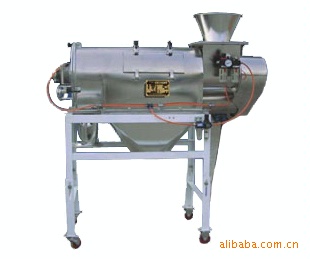 本设备筛网为圆筒状,置于机体内,物料通过螺旋输送系统后,和气流混合、雾化进入网筒内;通过网筒内风轮叶片使物料同时受离心力和旋风推进力,从而迫使物料喷射过网,由细料排出口排出,不能过网的物料沿筒壁从粗料排出口排出。