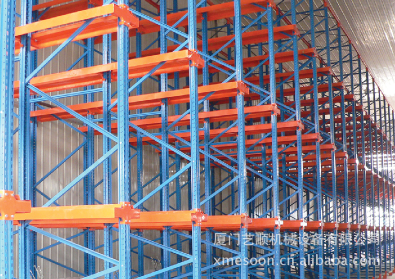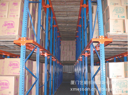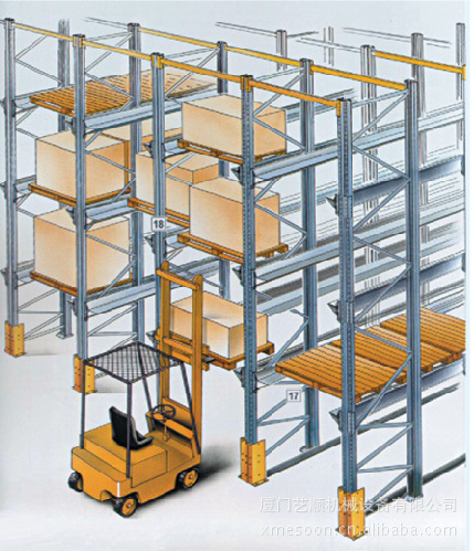 驶入式货架结构原理是把数排立柱片连接起来,没有横梁结构,用顶梁支撑,用牛腿和托盘导轨连接而成,托盘架在托盘导轨上,叉车可直接驶入货道内进行存取货物。存放时先内后外,取货时先外后内,先进后出存取方式。用最小的空间提供最大的存储量,仓库空间利用率为70%。