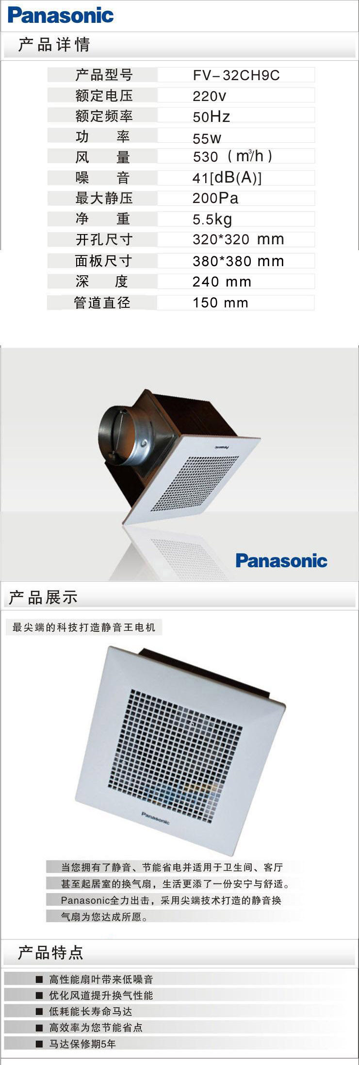 松下天花板型换气扇/排气扇集成吊顶吸顶式静音FV-32CH9C风量530
