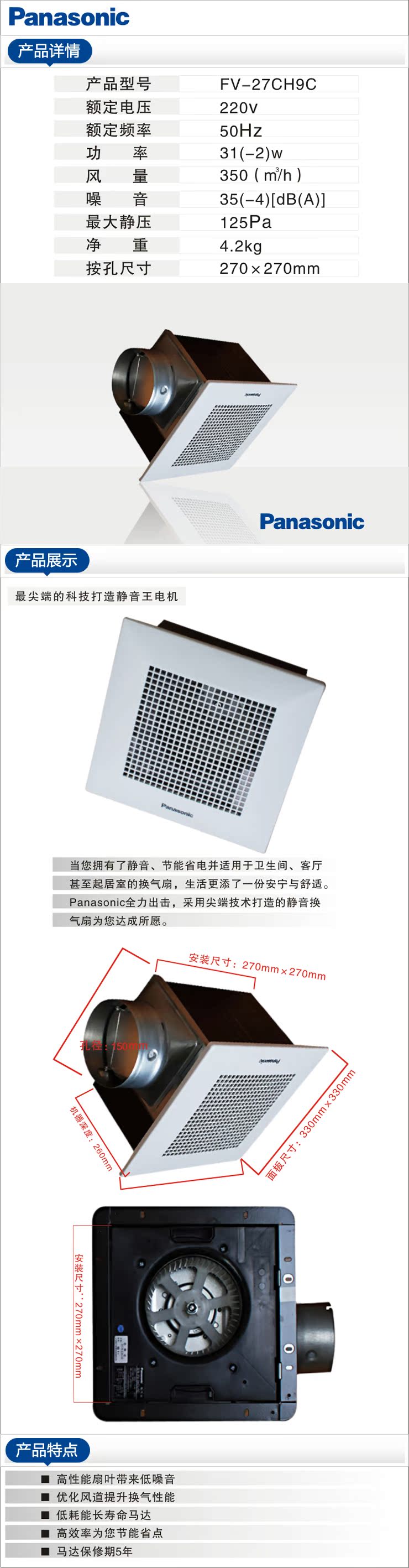 松下天花板型换气扇/排风扇集成吊顶吸顶式静音FV-27CH9C风量350
