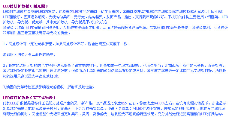 2,扩散板适用于侧光源LED照明灯具,如平板灯、广告灯箱、专业观片灯,通常和导光板搭配使用。