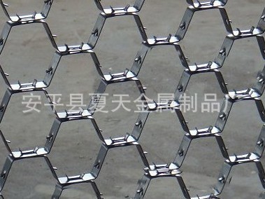 广泛应用于用于石油化工大型装置,特别是有利于催化剂化装置主要设备的衬里结构的主要配件之一,它能够提高衬里的耐磨性能和强度,耐磨衬里都用龟甲网加固,一般部位用碳钢(A3F)龟甲网、如反应器及一、二级旋风分离器、U型管再生器烟道等处, 高温部位用合金(1Cr13)龟甲网,如再生器及一、二级旋风分离器等处。龟甲网为20*17.5毫米的扁钢带冲成的六角形格,固定在保温钉端板上。